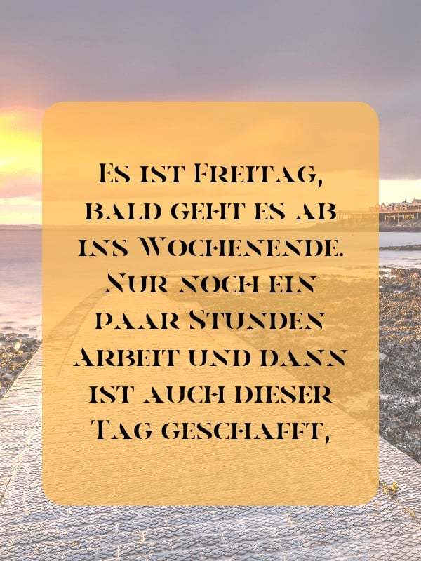 Montag ist der schlimmste tag, dienstag uns der chef nicht mag, mittwoch, ist es angenehm, donnerstag wird bald vergehen, freitag läutet das ende ein,denn. In diesem artikel haben wir sprüche zum freitagabend gesammelt.