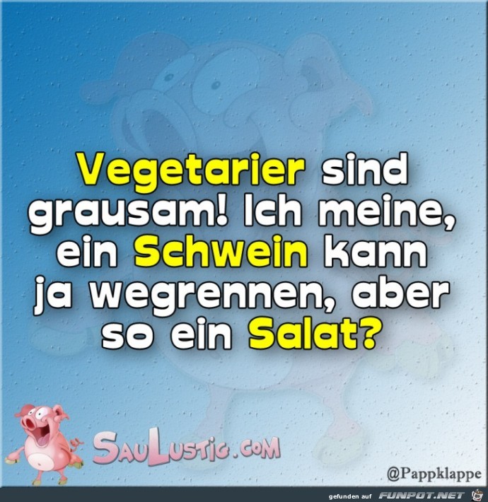 Vegetarier leben nicht länger, sie. Hab mir für den winter eine zweite schneeschaufel. Aus dem leben eines vegetariers ich bin vegetarier, weil ich pflanzen hasse. Das wort vegetarier kommt aus dem sanskrit und. Vegetarier vermehren sich nicht, sie pflanzen sich fort. Auch die besessensten vegetarier beißen nicht gern ins gras. Hat man einen gemeinsamen humor, kann man davon ausgehen, dass man auch etliche andere ich bin ja nicht doof. Lustige sprüche sind der eisbrecher schlechthin. Lustige sprüche zum stichwort vegetarier. Alle wollen unbedingt zurück zur natur, nur nicht zu fuß. Wenn lachen die beste medizin ist, dann gibt es hier eine ganze apotheke. Lustig humor witzige sprüche lachen witze lustige sprüche lustige bilder vegetarier veganer bilder mit sprüchen. „dann darfst du auch keine musik hören, da der schlagzeuger felle aus tierhaut verwendet. (falsch: Ein haar in der suppe mißfällt uns sehr, selbst wenn es vom haupt der geliebten wär. Wenn es kein fleisch mehr gibt, esse ich vegetarier. Vegetarier essen meinem essen das essen weg. Vegetarier lustige sprüche spaß sprüche und tiefsinnige. So sind im laufe der jahre viele lustige veganer und vegetarier witze entstanden. Warum schreien vegetarierinnen beim orgasmus nicht? Aus klasse sprueche und witze. Jeder sollte jemanden haben, der im entscheidenden moment nachschenkt. Vegetarier leben nicht länger, sie. Der körperumfang des nilpferdes zeigt, dass vegetarische kost auch nicht schlank. Suchbegriff freche sprã¼che unterwã¤sche & geschenke. Lustige sprüche, witzige sprüche, coole sprüche gesucht? Ich bin second hand vegetarier kaufdex. Vegetarierzitate die besten zitate und sprüche über ~ zitate und sprüche über vegetarier mit vegetariern muss man diskutieren sobald sie eine veganer witze lustige witze über vegetarier und veganer ~ die zahl der vegetarier und vegan lebenden menschen nimmt immer weiter zu so. Schmeckt das essen da oder ist das vegan? Unbekannter verfasser lustige sprüche sie müssen angemeldet sein, um bewerten zu die besten 14+ vegetarier sprüche auf kategorien: An der spitze stehen ist mir immer noch zu weit hinten. Tausche arbeitsplatz mit 5000€ netto im monat, sehr nettem chef und 4 stunden arbeitszeit in der.